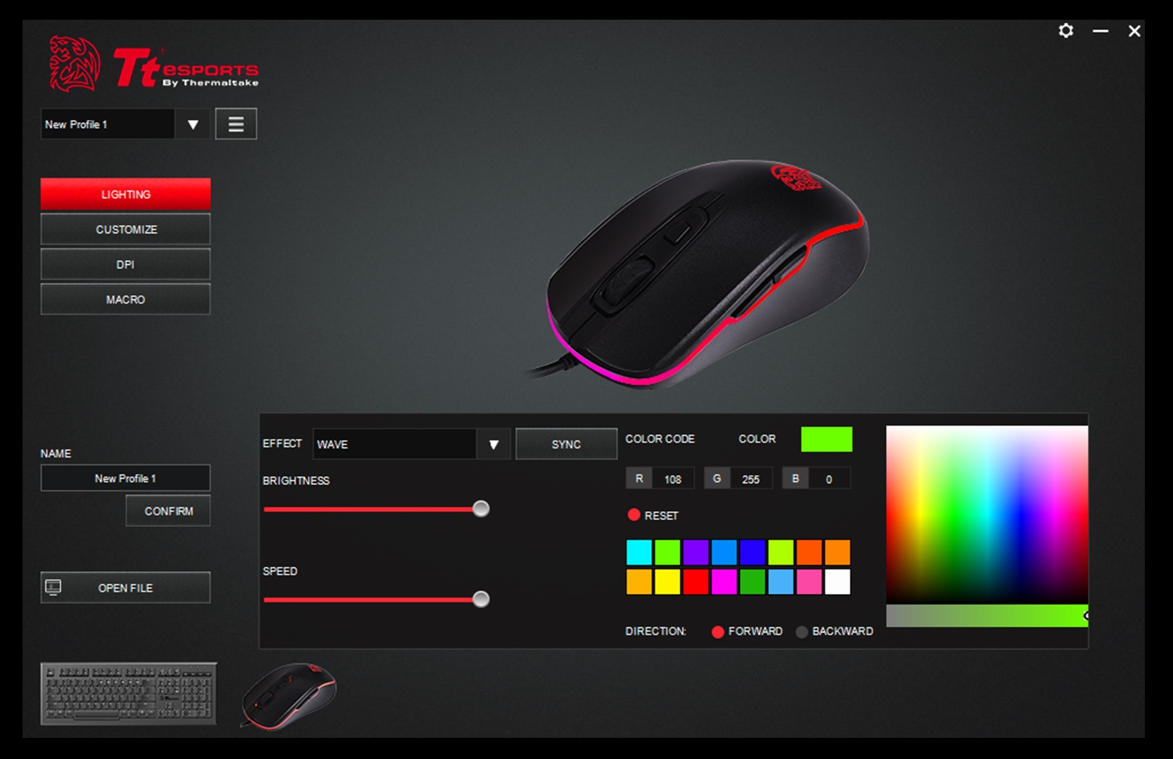 The Challenger Elite RGB combo gaming mouse features a precise and accurate optical sensor that offers on-the-fly default sensitivity up to 3200 DPI (400 DPI / 800 DPI / 1600 DPI / 3200 DPI) or via 200 DPI increments with the Tt eSPORTS gaming software.