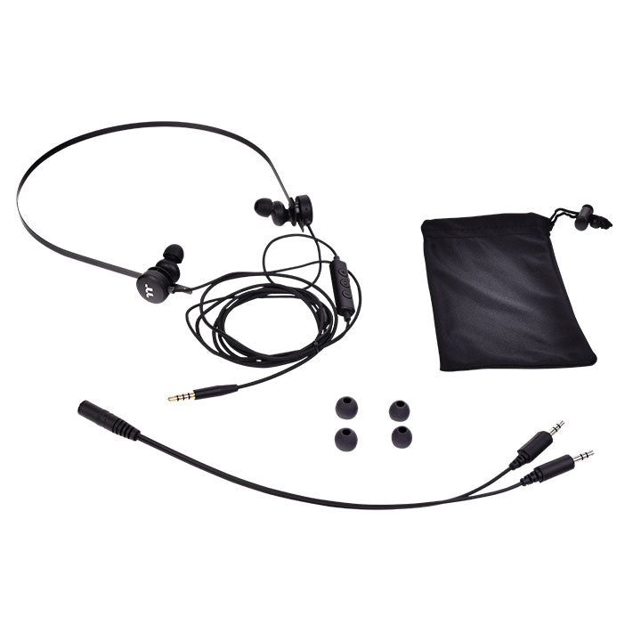 Includes two sets of additional ear-tips, a 4pin 3.5mm to 2X 3.5mm adapter, and a pouch.